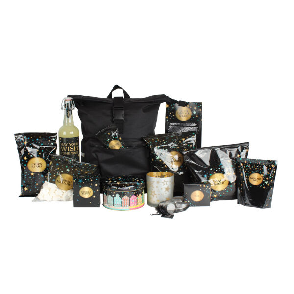Creëer een warme sfeer met gouden theelichtjes, een stijlvolle houder en een chique zwarte fietsrugtas van gerecycled materiaal. Geniet van kaneelkoekjes uit een feestelijke trommel, karamelpopcorn, vanillefudge, stervormige chips en zoete marshmallows. Voor het hartige moment zijn er geroosterde broodjes met brie, een karamelpindamix en een frisse limonade. De pannenkoekenmix maakt het feest compleet. Make a Wish is een betoverend kerstpakket dat sfeer, smaak en duurzaamheid samenbrengt. Perfect om iemand écht te verrassen.