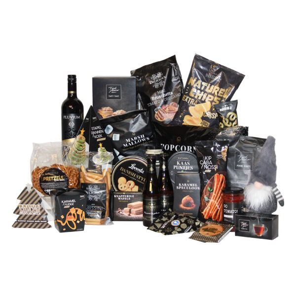 Dit royale kerstpakket doet zijn naam eer aan: uitpakken wordt een feestje. Met premium pils, rode wijn en een mix van hartige lekkernijen zoals cabanossi, kaaspuntjes, toast, pastasaus, pasta en bruschetta’s zet je in no-time een smaakvol borrelmoment of diner op tafel. Geniet tussendoor van pretzels, ribbelchips, fudge, stroopwafels, truffels, popcorn en meer zoete verwennerij. De kabouterdecoratie en Tony’s Tiny’s kerstboom zorgen voor een vrolijke, feestelijke sfeer. Uitpakken maar! is hét kerstpakket voor wie houdt van variatie, kwaliteit en een goed gevuld cadeau.