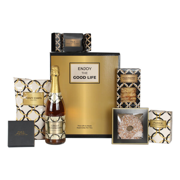 Met het pakket Enjoy the Good Life (Large) vier je de feestdagen in stijl. Een luxe geschenkverpakking gevuld met verfijnde lekkernijen en een vleugje entertainment. Speel samen het Find It Party spel en geniet ondertussen van een glas frisse sparkling grape. Voor de hartige trek zijn er knapperige kaaskoekjes en ribbelchips, terwijl de zoetekauw verwend wordt met fudge speculaas, delicate filo pastry koekjes en XL chocolade musketkransen. De luxe thee in cadeauverpakking maakt dit feestelijke moment compleet. Enjoy the Good Life (Large) is hét perfecte relatiegeschenk om waardering te tonen en de feestdagen onvergetelijk te maken.