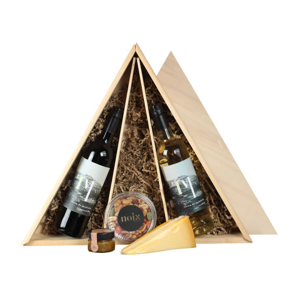Het Tierra de Montaña pakket combineert het beste van de natuur met pure smaak. Twee vegan-biologische wijnen bestaande uit een frisse Verdejo en een volle Tempranillo vormen de basis van dit luxe geschenk. Daarbij horen een royaal stuk extra belegen kaas, een verfijnde mosterd-dille dip en een knapperige Zeistermix. Stijlvol verpakt in een houten driehoekkist met schuifdeksel en vakverdeling is dit een cadeau dat klasse en duurzaamheid uitstraalt.